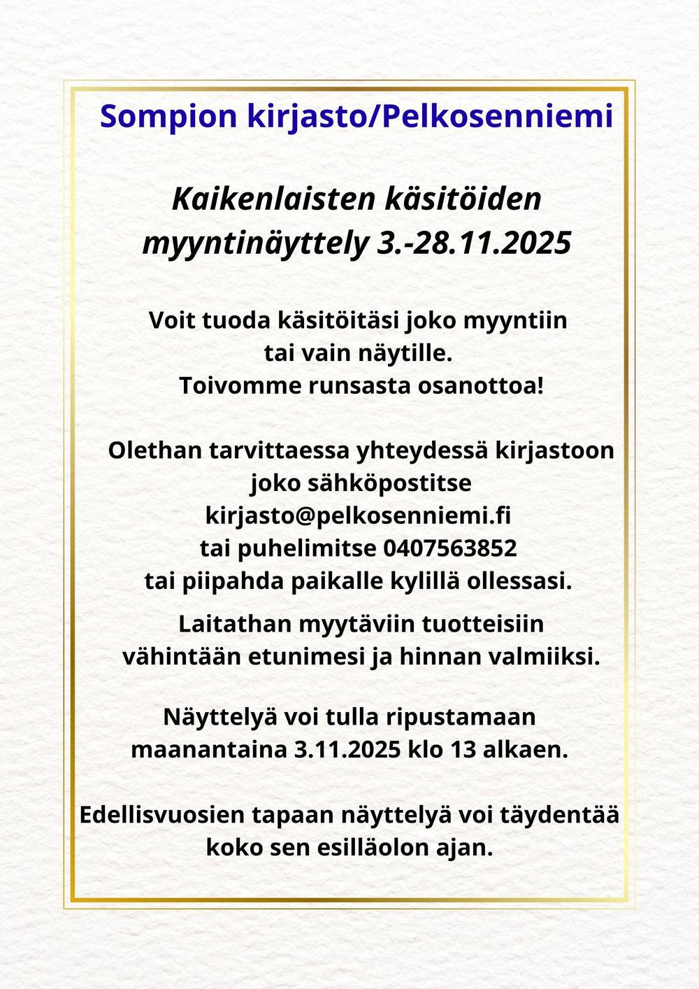 Kirjaston puhelin 040 756 3852, kirjasto(at)pelkosenniemi.fi.